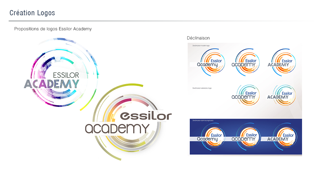 Différentes propositions de logos pour Burgos et Essilor Academy